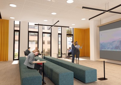 La nouvelle salle polyvalente s’adapte aux différentes temporalités et usages nécessaires au sein d’une tour de bureau. La régie surplombe l’estrade, idéale pour les séminaires ou conférences. La modularité de la salle lui permet d’être partitionnable et ainsi accueillir tout type de fonctions via des assises mobiles.