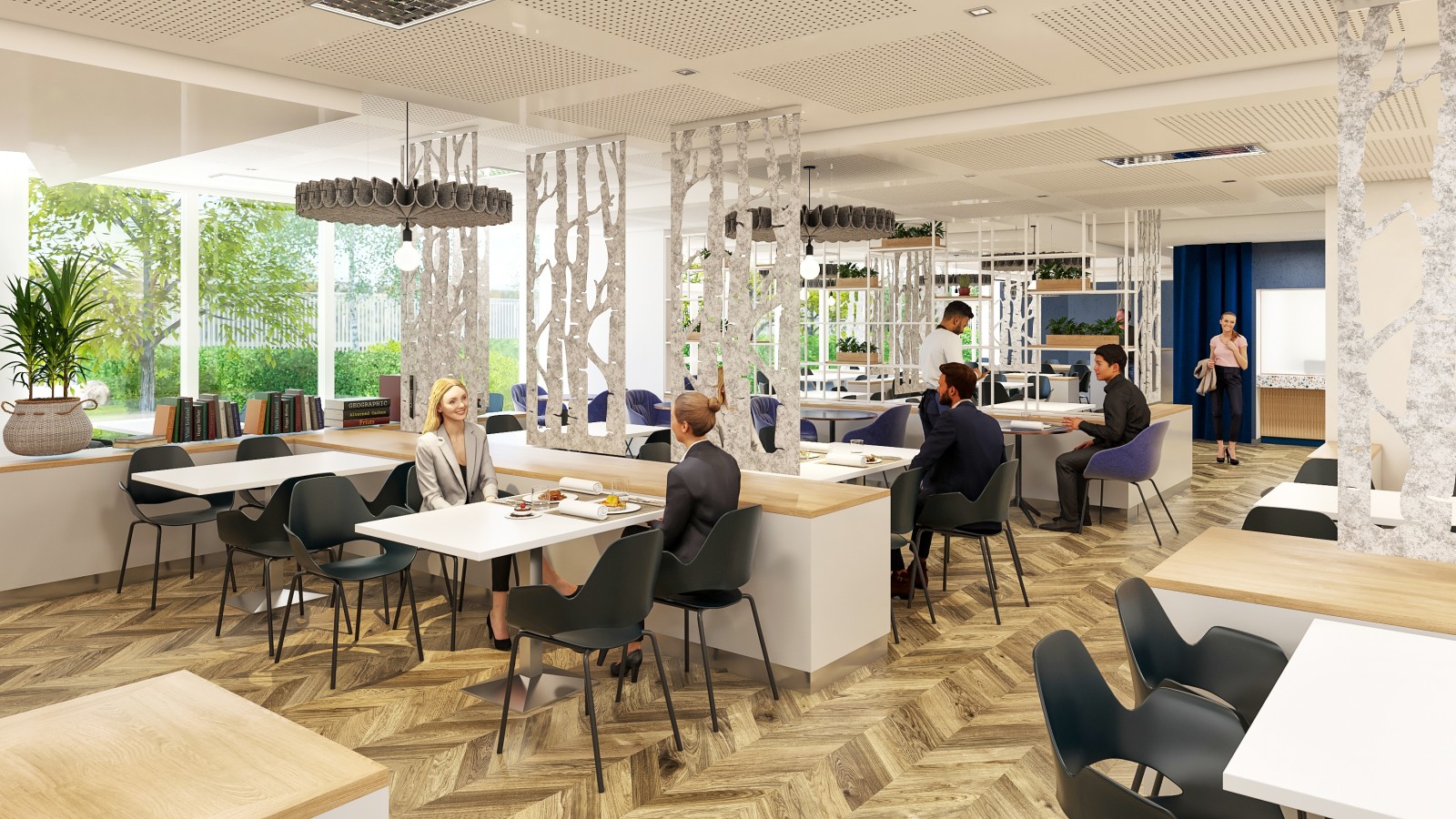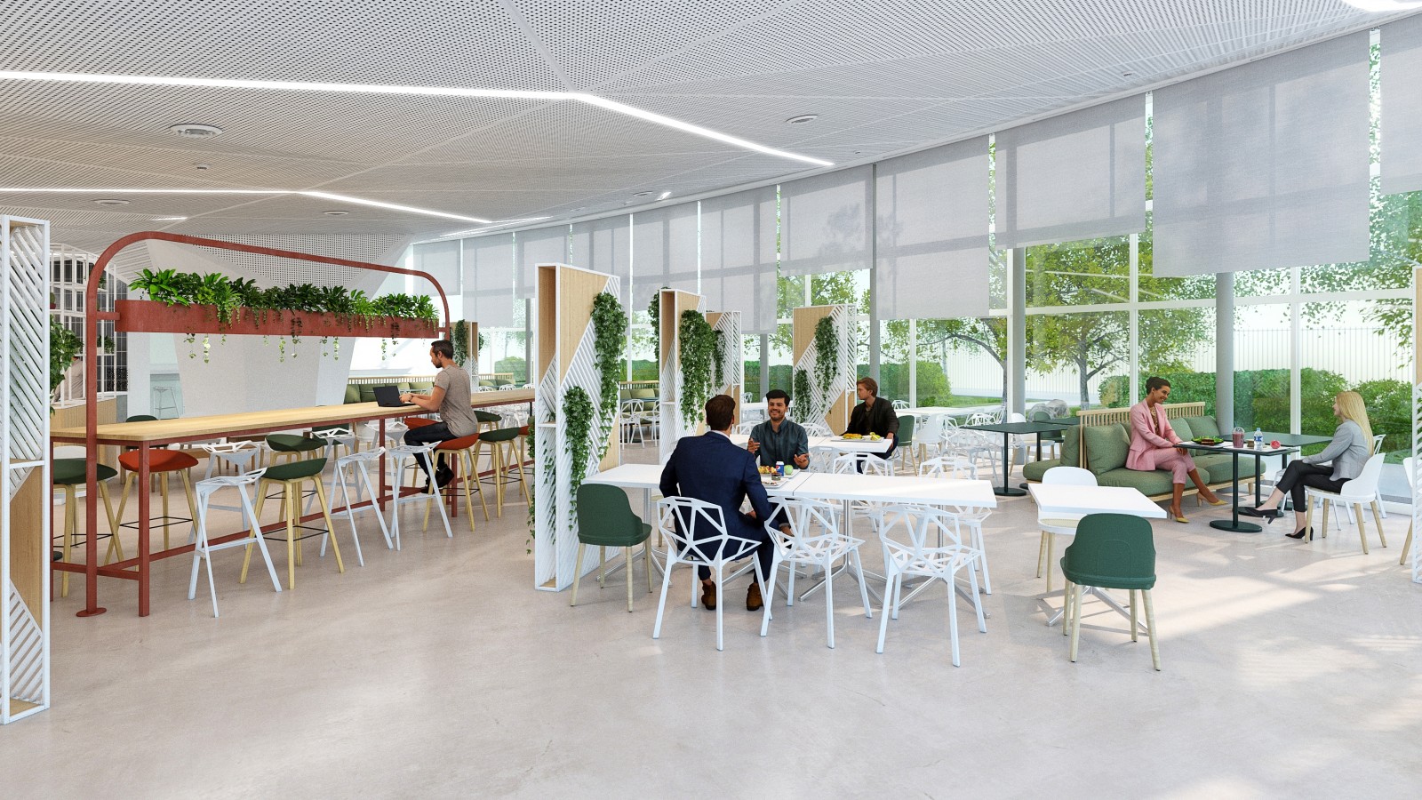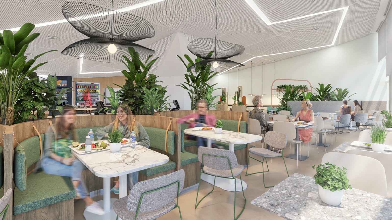 Dans le cadre de la requalification complète des espaces de restauration de la Tour Eqho, à La Défense, notre mission s’est inscrite dans une réflexion à la croisée de l’architecture, de l’usage et du bien-être. Avec ses plus de 70 000 m² de bureaux répartis sur plusieurs dizaines d’étages, la Tour Eqho est une véritable ville verticale. C’est cette analogie entre la tour et la ville qui a guidé notre approche conceptuelle, chaque restaurant devenant une entité inspirée d’un lieu urbain familier et offre une ambiance spécifique — intimité, convivialité, nature ou effervescence — permettant aux utilisateurs de varier les expériences selon leurs besoins au cours de la journée. Cette diversité favorise le bien-être, les échanges et la qualité de vie au travail en recréant des repères émotionnels et sensoriels au coeur de la tour.